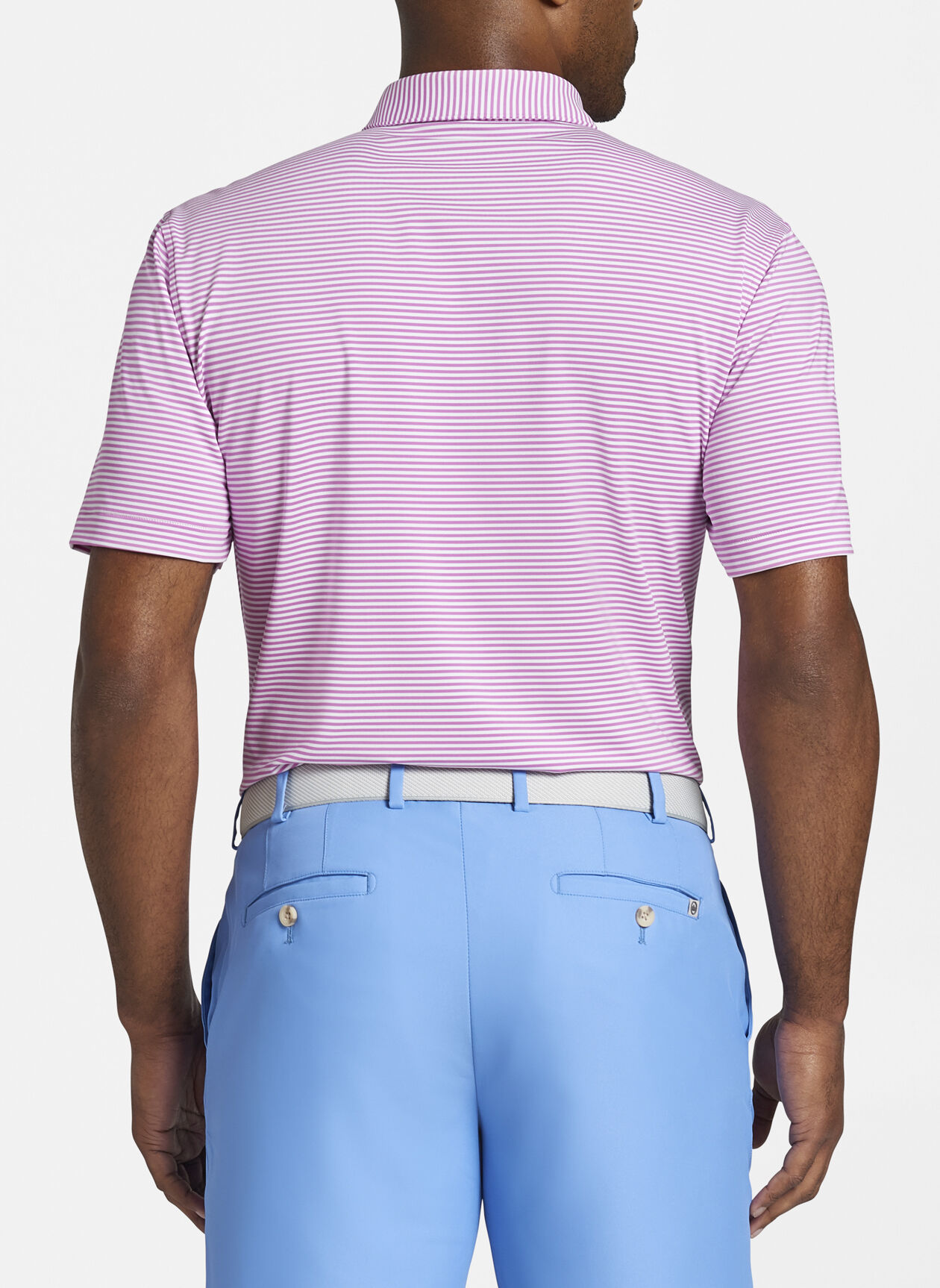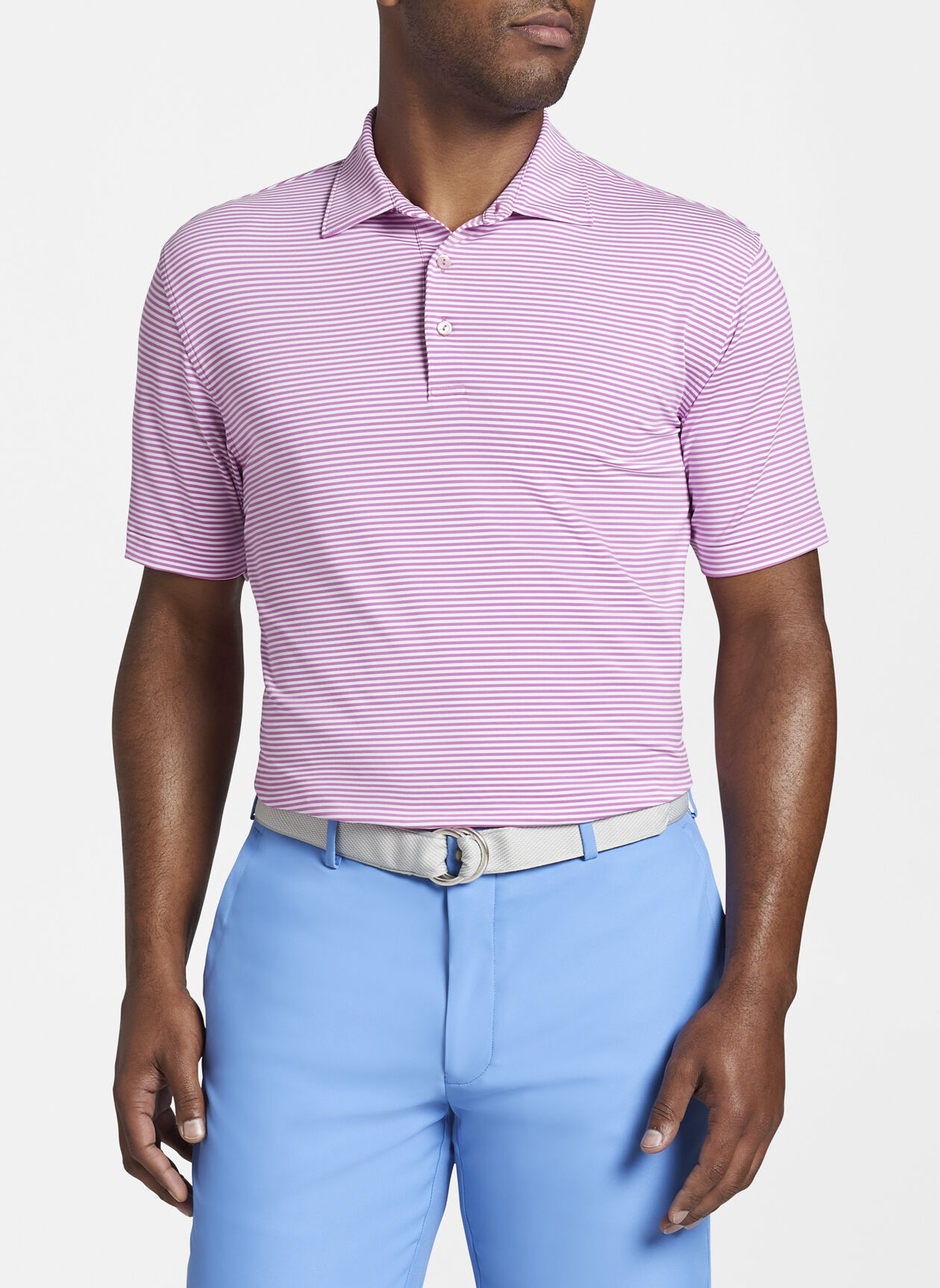 The Hales stripe polo is made from our signature stretch jersey fabric. The properties of this fabric offer four-way stretch, moisture-wicking, quick-dry, odor control, easy-care and UPF 50+ sun protection. Styled with Sean self-fabric collar and three-button placket.