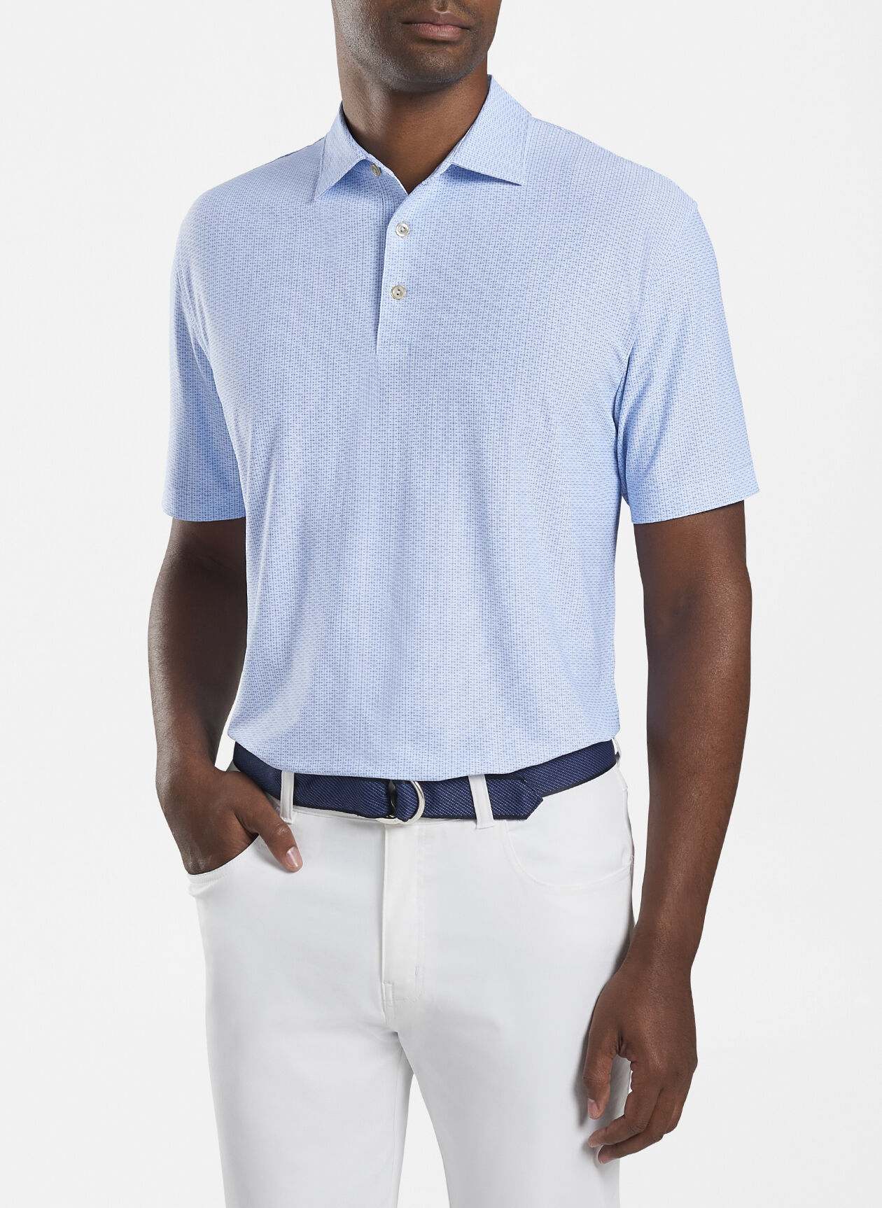 This polo offers sharp style and technical performance that make it a staple in any wardrobe. It’s constructed using a lightweight, easy-care mesh fabric that wicks moisture and stretches four ways for optimal mobility on and off the course. A novelty print adds a touch of unique style. Finished with a Sean self-fabric collar and three-button placket.